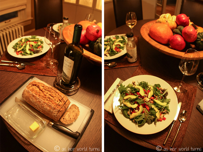 We whip up some soup, salad, bread, and white wine for dinner. My uncle has food presentation down to an art.