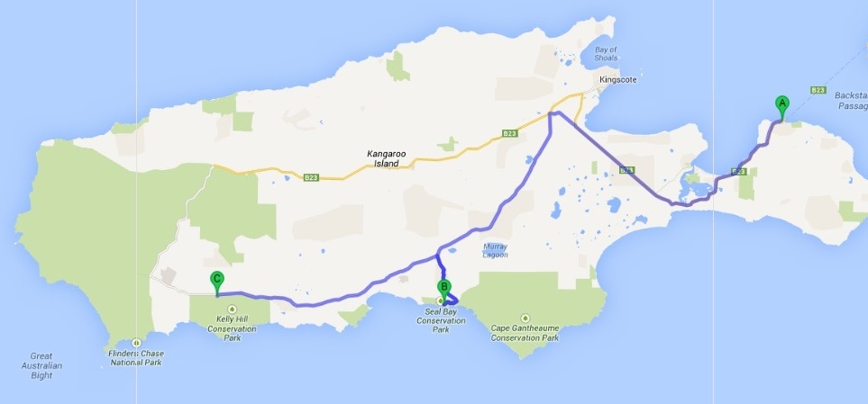 While Groovy Grape’s typical Kangaroo Island tour includes kayaking, that activity isn’t as much fun on a rainy day like today. So we go to plan B: exploring the Kelly Hill Caves (“C” on the map below).